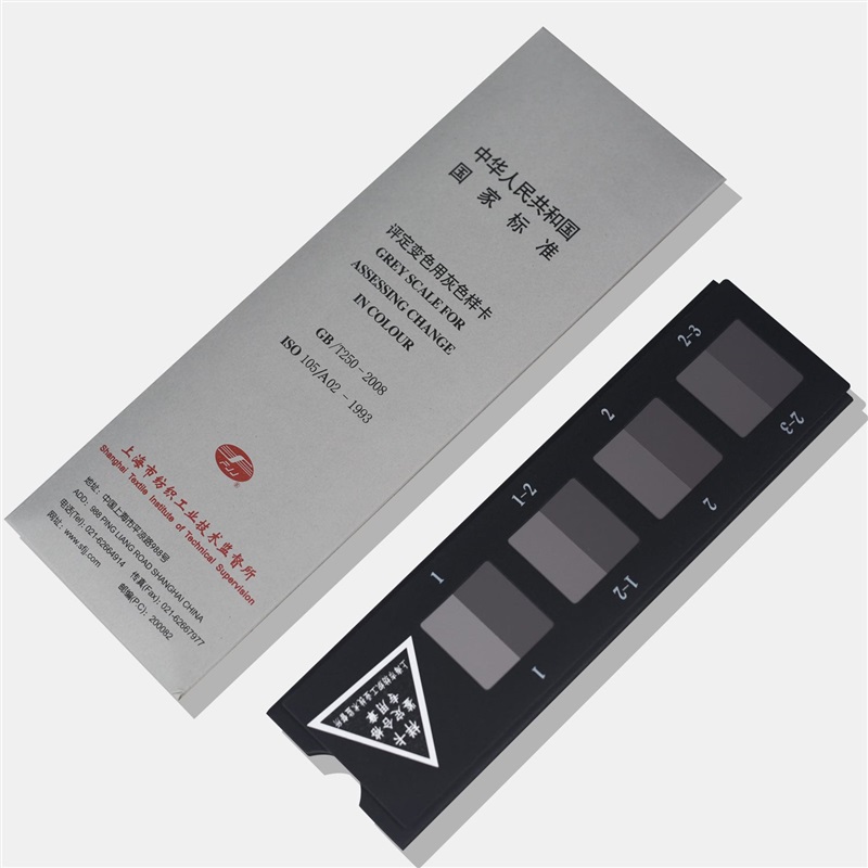 本标准等同采用国际标准ISO105/A02-1993《纺织品—色牢度试验—评定变色用灰色样卡》,用于评估色牢度测试中的变色、沾色,分1-5级,半级递增,装于包套内。本系列灰卡为国际通用的5级9档规格类型。灰卡灰度完全采用ISO,AATCC、GB提供的色度学数据,经过精心配色制成。每一档的色度学数据均使用进口高精度分光光度计测定,并用中国计量科学院的色度学传递基准进行校正,确保其灰度数据同国际一致。